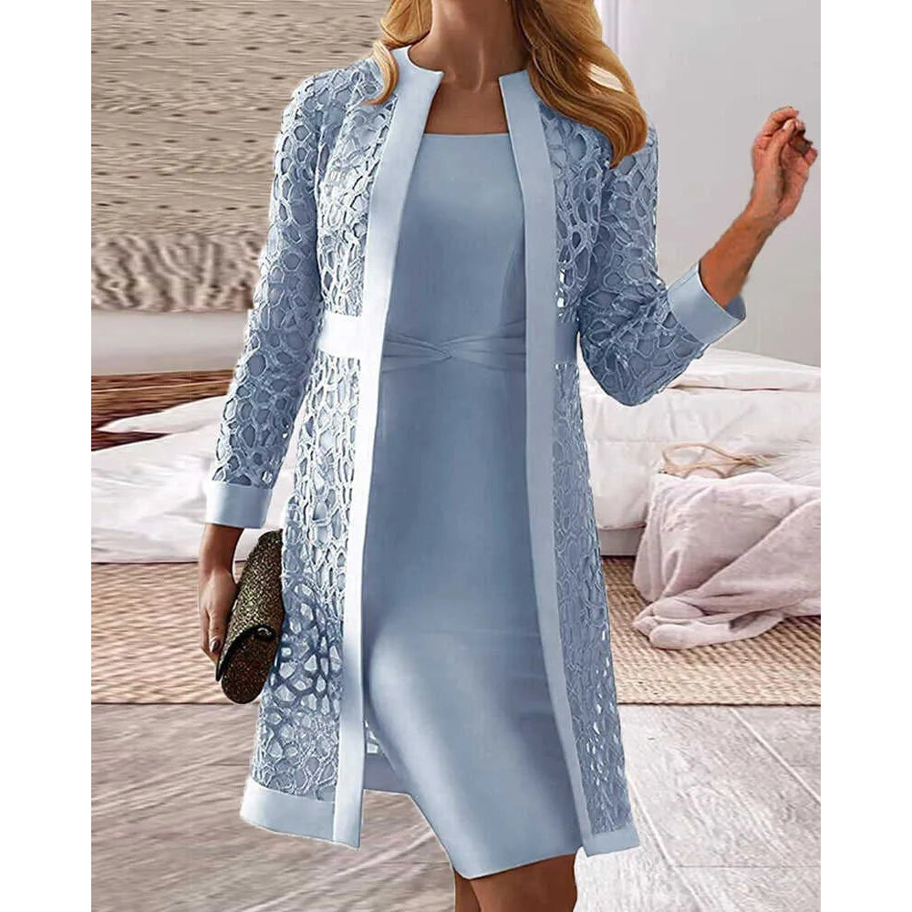 Dieses zweiteilige Set besteht aus einem eleganten Innenkleid und einer langärmeligen Außenschicht, die für zusätzliche Dimensionen sorgt. Die Kombination schafft eine glatte, schmeichelhafte Silhouette und bietet gleichzeitig volle Bedeckung. Es wurde für Leichtigkeit und Eleganz entworfen und sorgt für einen selbstbewussten und dennoch dezenten Look. Ein perfektes Paar für legere und elegante Stylings.