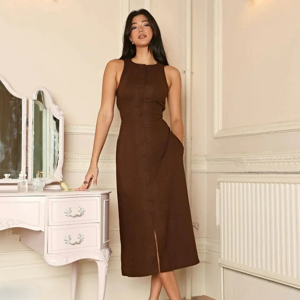 Das Anna-Kleid ist sowohl stilvoll als auch bequem, denn es hat eine lockere Passform, die eine gute Bewegungsfreiheit ermöglicht. Praktische Seitentaschen sorgen dafür, dass Sie Ihre wichtigsten Utensilien immer griffbereit haben, ohne auf Ästhetik verzichten zu müssen. Dieses Hemdblusenkleid lässt sich sowohl leger als auch zu halbformellen Anlässen tragen und bietet ein ausgewogenes Verhältnis zwischen Bequemlichkeit und Eleganz. Dank seiner schmeichelhaften Silhouette kann es von morgens bis abends getragen werden.