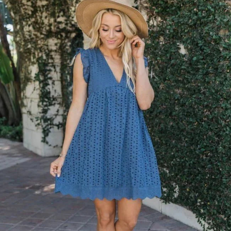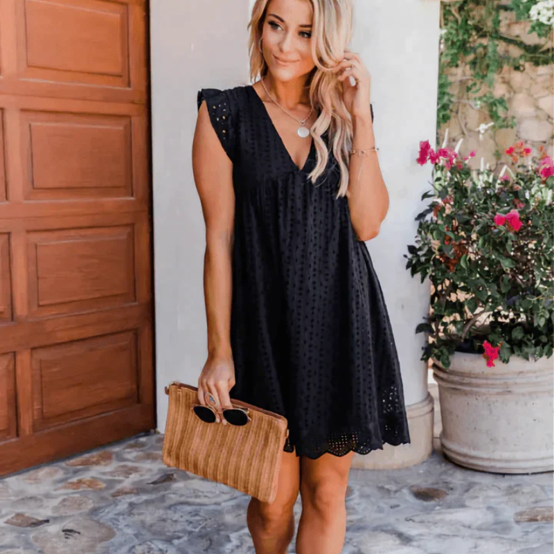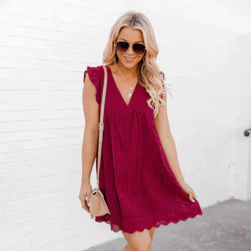 Vom gemütlichen Spaziergang bis zur gemütlichen Party – dieses Kleid passt sich ganz natürlich jedem Anlass an. Das ärmellose Design sorgt für einen leichten und unkomplizierten Look – perfekt für entspannte Anlässe. Die Ösen-Akzente verleihen Charme, ohne die Schlichtheit des Kleides zu überdecken. Es kann pur getragen oder mit Accessoires für mehr Eleganz aufgepeppt werden. Eine vielseitige Option für mühelose Eleganz im Alltag.
