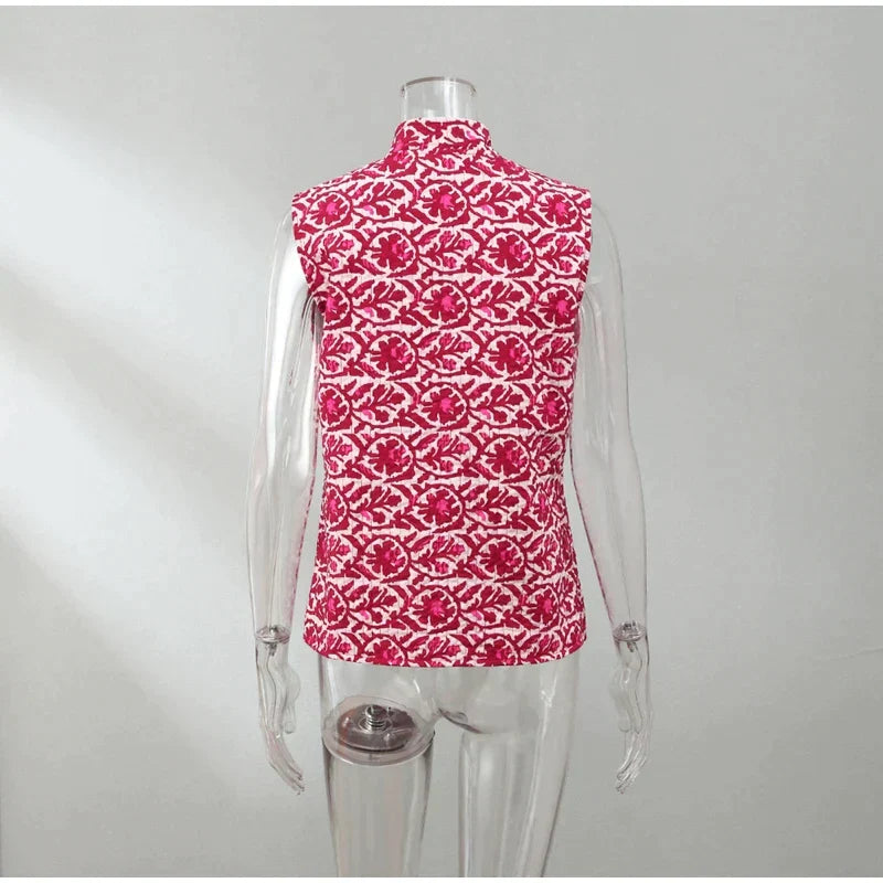 Tragen Sie sie solo für einen schlichten, auffälligen Look oder kombinieren Sie sie mit Accessoires für ein stilvolleres Finish. Der ärmellose Schnitt macht sie leicht und anpassungsfähig, während der Druck sie zu einem Must-have in jeder Garderobe macht. Knopfdetails verleihen Funktion und Form und werten die Weste auf, ohne sie zu überladen. Barbara bietet Ihnen eine raffinierte Option, die ebenso flexibel wie stilvoll ist. Sie ist die perfekte Wahl, wenn Sie etwas Auffälliges und Bequemes zugleich suchen.
