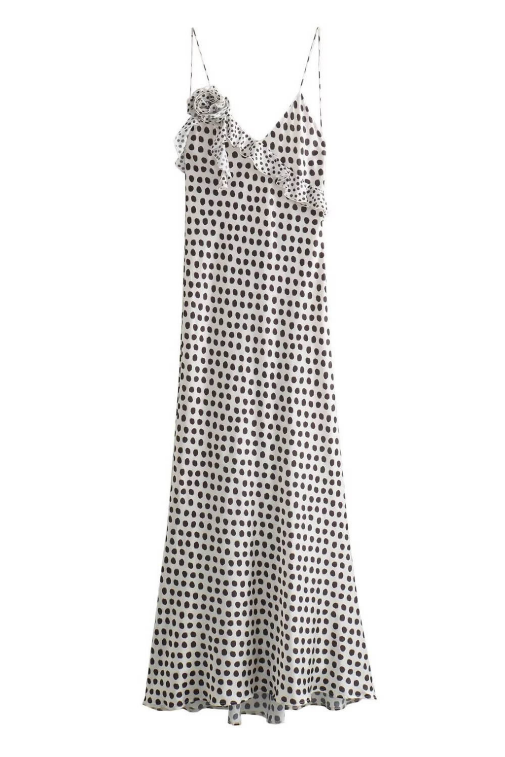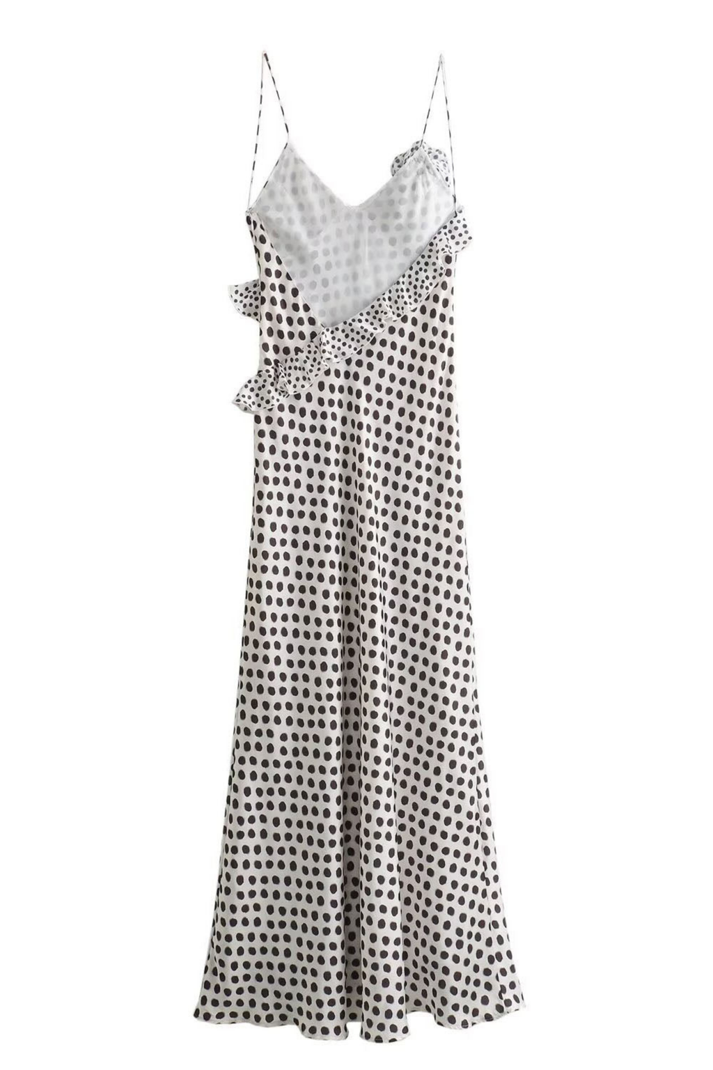 Das Elara Kleid verbindet klassischen Stil mit einer modernen Silhouette und ist ein vielseitiges Kleidungsstück, das verspielt und raffiniert zugleich wirkt. Mit seinem schwarz-weißen Tupfenmuster und dem fließenden, bodenlangen Schnitt ist es wie geschaffen für Frauen, die Komfort lieben, ohne auf Eleganz verzichten zu müssen.