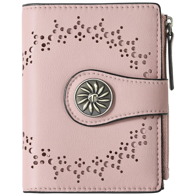 Das Portemonnaie hat eine rechteckige Silhouette mit sanft abgerundeten Ecken. Entlang des Randes sorgen ausgeschnittene Details für Dimension und Textur. Auf der Vorderseite befindet sich ein Schnappverschluss mit einem sonnenförmigen Metallknopf als Herzstück. Auf der äußeren Rückseite befindet sich ein Reißverschlussfach für zusätzlichen Stauraum.
