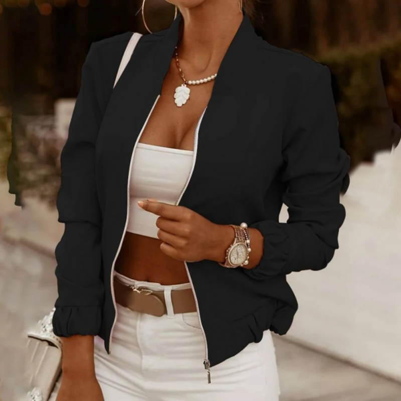 Die Elina Jacke besticht durch ihre schmale Passform für einen modernen und geradlinigen Look. Die langen Ärmel bieten ausgewogenen Schutz und Vielseitigkeit für den Lagenlook. Der Reißverschluss sorgt für praktische Funktionalität und ein schlichtes Finish. Diese Jacke lässt sich problemlos mit verschiedenen Casual-Styles kombinieren und sorgt für einen eleganten und dennoch entspannten Look. Sie ist eine elegante Ergänzung für Ihre Alltagsgarderobe.
