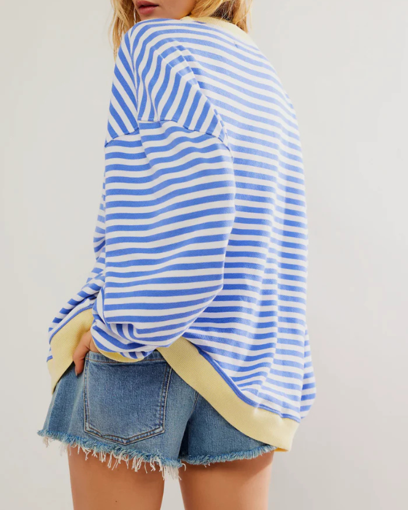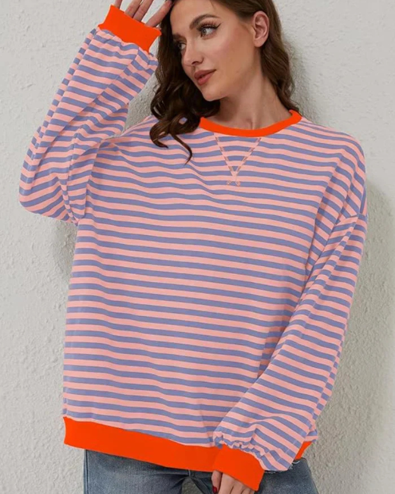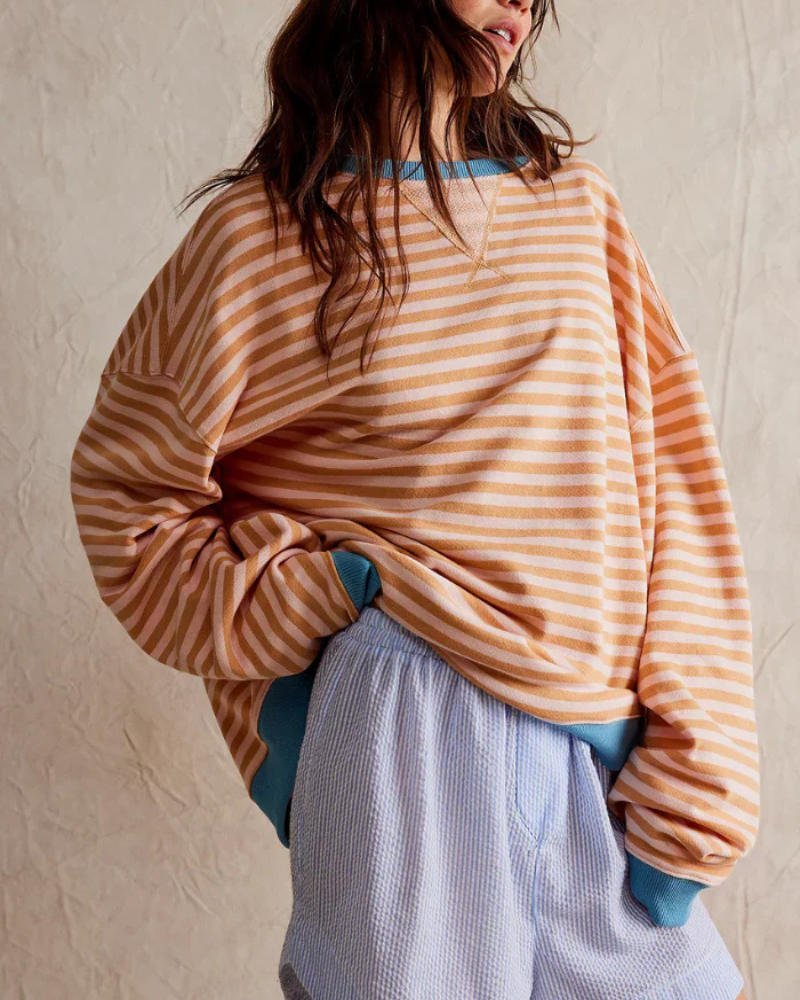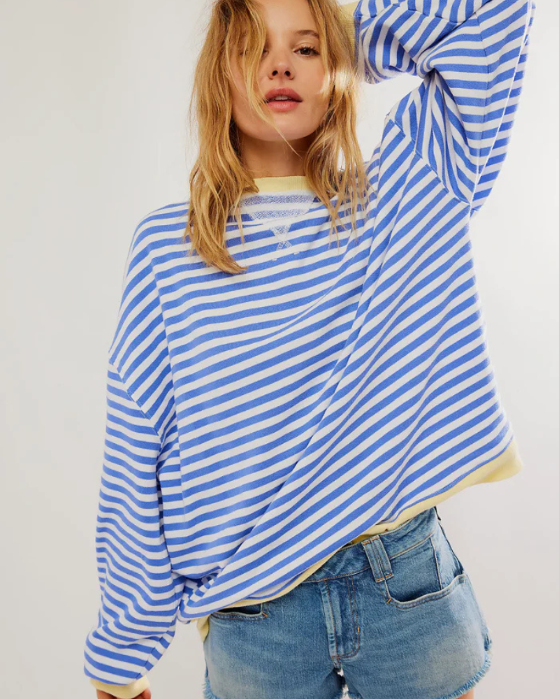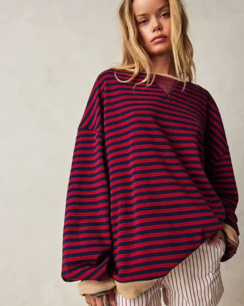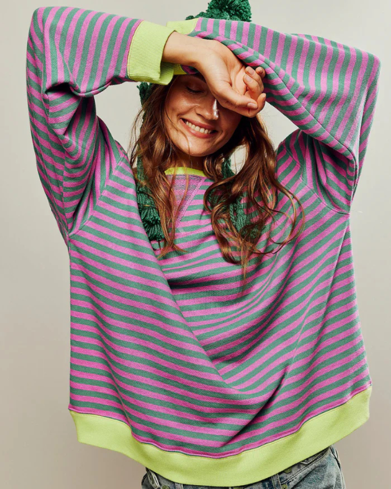 Der Emma Pullover besticht durch seine lässige Silhouette, die Komfort und Style vereint. Der klassische Rundhalsausschnitt sorgt für einen klaren und zeitlosen Look. Das Streifenmuster setzt einen dezenten Akzent, ohne Ihr Outfit zu dominieren. Die lockere Passform bietet Bewegungsfreiheit und lässt Ihren Stil natürlich zur Geltung kommen.
