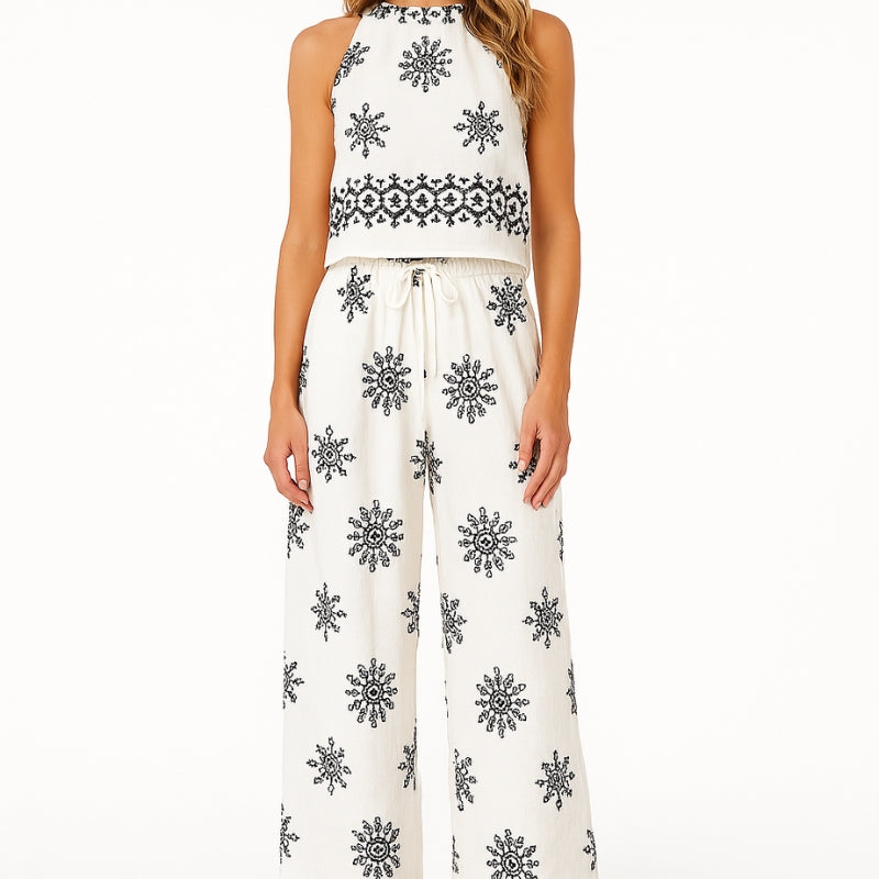 Dieses zweiteilige Melina-Set besteht aus einem ärmellosen Top mit zarter Stickerei und einer hoch taillierten Hose mit weitem Bein für einen schicken, bequemen Sitz. Die entspannte Silhouette bietet Bewegungsfreiheit und gleichzeitig eine elegante Optik. Die Stickerei verleiht dem Gesamtlook eine dezente, raffinierte Note. Perfekt für lässige Ausflüge, vereint dieses Set mühelos Stil und Leichtigkeit. Die fließenden Linien schmeicheln verschiedenen Körperformen.