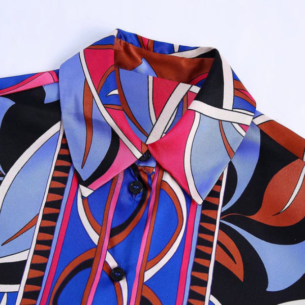 Mira ist ein Zweiteiler, der markantes Design in den Vordergrund stellt. Das Hemd präsentiert sich mit einem Allover-Muster und detailreichen Details. Kombiniert mit dem passenden Rock wirkt der Look einheitlich, ohne zu einheitlich zu wirken. Jedes Teil wirkt harmonisch und erzeugt ein auffälliges Design, das subtil die Aufmerksamkeit auf sich zieht.
