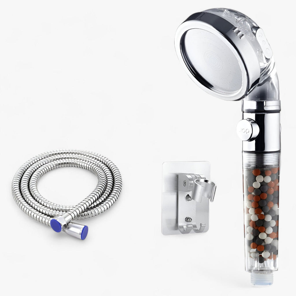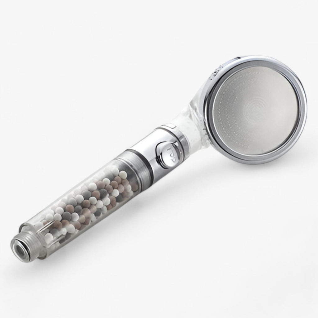 Genießen Sie den zusätzlichen Vorteil der natürlichen Mineralfilterung, die das Wasser reinigt und gleichzeitig Ihre Haut sanft massiert. Ob Sie nun einen entspannenden Regen oder einen kräftigen Strahl bevorzugen, dieser Duschkopf hinterlässt ein glattes und erfrischtes Hautgefühl. Außerdem pflegt er Ihre Kopfhaut und Ihr Haar und schenkt Ihnen nach jeder Anwendung ein erfrischendes Gefühl des Wohlbefindens.