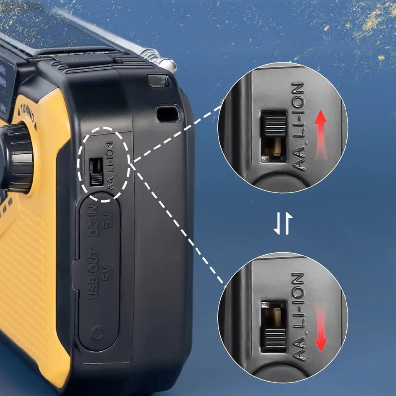 • Stromversorgung über Akku, USB, Handkurbel oder Solarpanel.