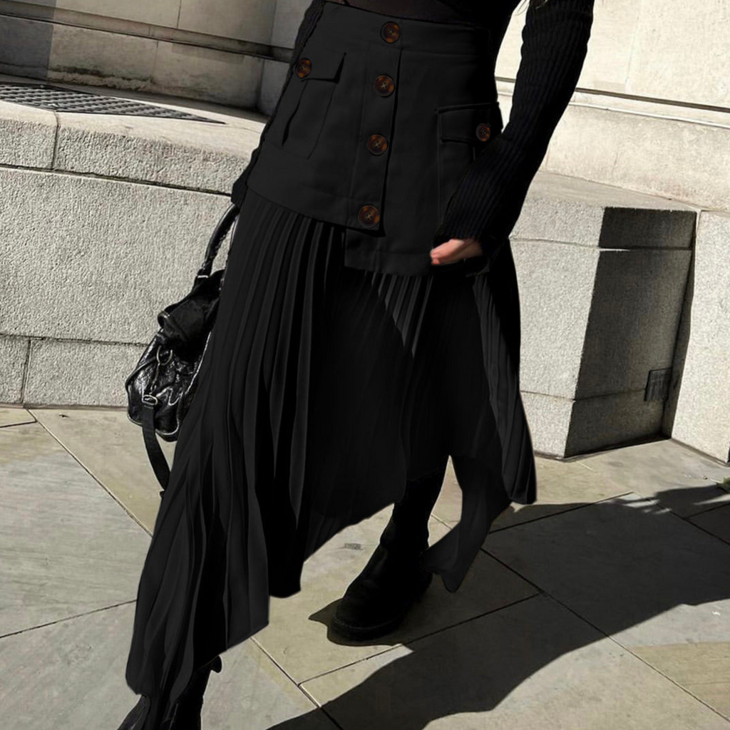 Soraya vereint markante Struktur und anmutige Bewegung in einem raffinierten Design. Der markante Lagenlook imitiert die obere Hälfte einer eleganten Wickel-Silhouette mit übergroßen Knöpfen und funktionalen Akzenten, während die untere Hälfte mühelos fließt und einen sanften Kontrast bildet. Ein Rock, der dezent hervorsticht und ein selbstbewusstes Statement setzt, ohne zu aufdringlich zu wirken.