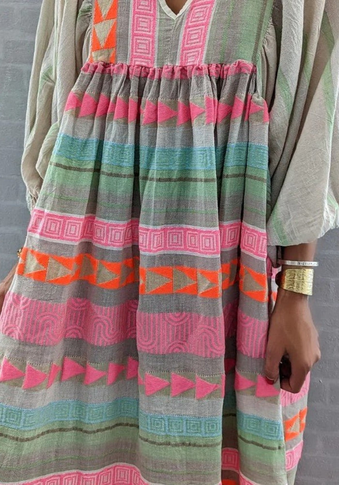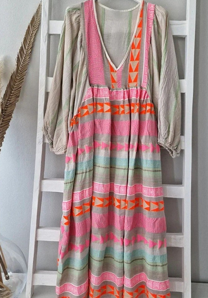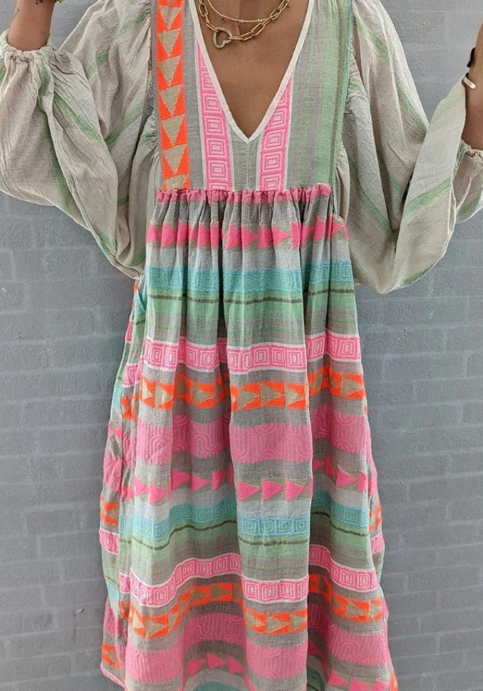 Das weite Kleid Wanda mit Print verleiht Ihnen einen entspannten und eleganten Look. Der V-Ausschnitt setzt ein weiches und schmeichelndes Detail. Die langen Ärmel sorgen für eine schöne Balance, ohne schwer zu sein. Das Kleid folgt sanft Ihren Bewegungen und lässt sich so den ganzen Tag bequem tragen. Es ist die perfekte Wahl, wenn Sie Komfort und Stil in einem Kleidungsstück suchen.