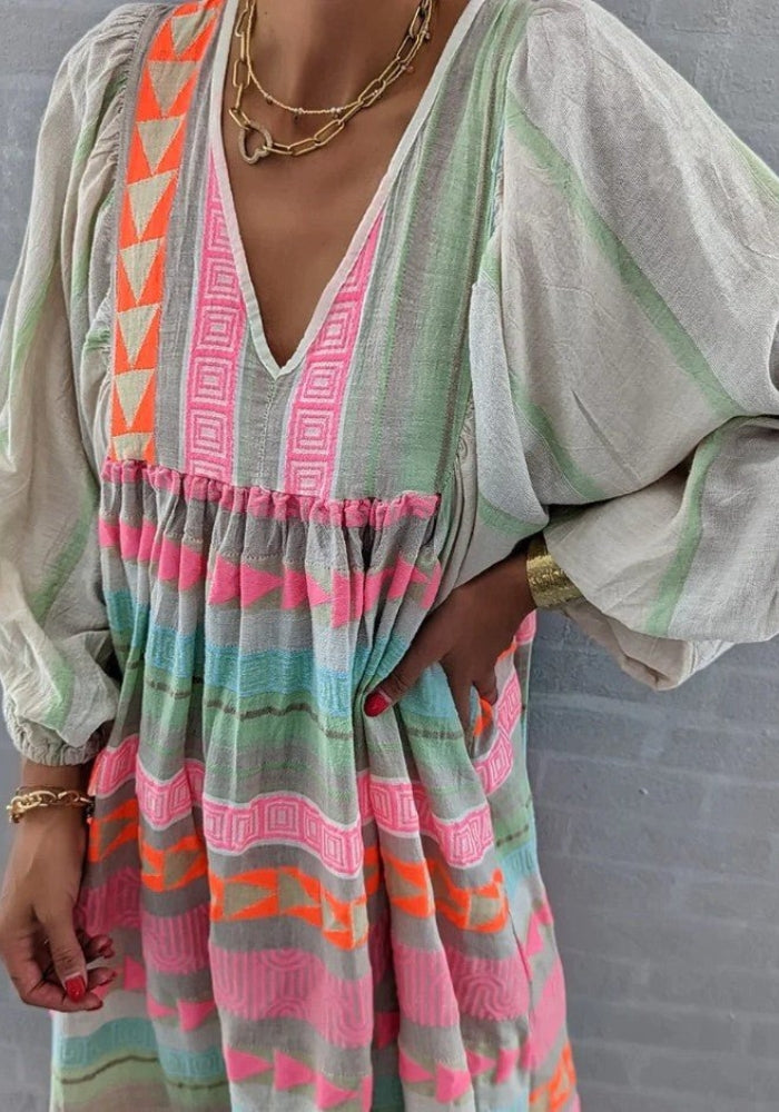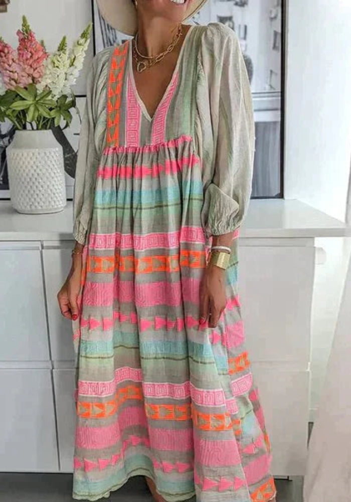 Wanda – Elegantes bedrucktes lockeres Kleid mit V-Ausschnitt und langen Ärmeln